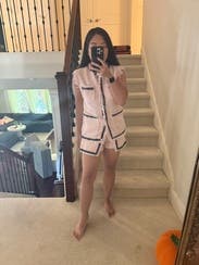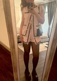 pink tweed dream set. due to availability, i snagged a size up in the top but it still worked for an oversized fit. if you grab the shorts too, just a heads up that the waist runs a tad small.