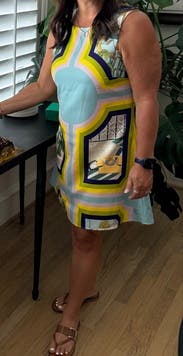 Easy shift dress to throw on, not the most flattering shape. Pattern/colors are great