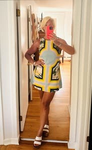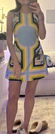Very cute/unique and gave me Versace vibes. I will say, many of the comments mentioned it being too small on the bust, but I have a larger bust, and I actually felt the dress was slightly too large on me. If you have a narrow rib cage, but a larger bust your size or a size down should still work ok. Also, I am 5’5 and felt the dress was just an inch too long. It will probably fit more as a mini dress if you’re taller!