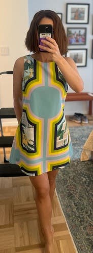 Absolutely loved the art and colors had to rent! I went smaller size than usual and it actually was tight on my chest, loose on the rest of the dress. Not too much stretch either. Loved the balustrades and old school phone and the unusual mix of colors- so cool!!