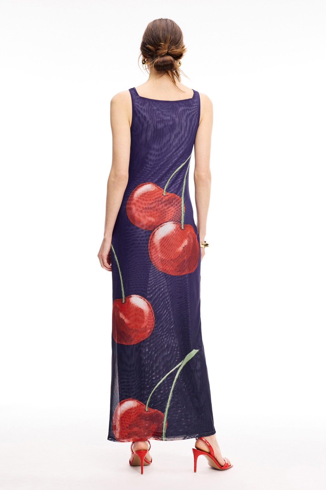 The Muma World Night Cherry Midi Dress features a playful cherry print and a flattering silhouette, perfect for adding a touch of fun to your wardrobe. Pair it with white sneakers and a crossbody bag for a casual, stylish look.