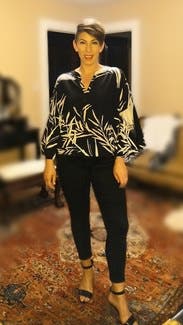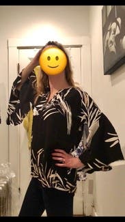 I liked the pattern of this shirt. I wasn't a fan of the fabric (as I thought it didn't look high quality). I needed to wear a lace cami underneath because it was low cut. I wore if a few times to dinner and people did love it!