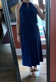 I loved this dress it was really comfortable and flattering. I got a lot of compliments when I also wore this too work. It's very versatile and can be dressed up or down. Is a lovely hue of midnight blue. The fabric falls nicely and hugs all the right places. Will definitely rent this again.