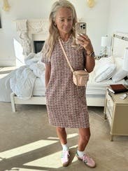 The N Natori Pink Tweed Mini Dress is a timeless piece with a sophisticated silhouette. For a versatile look, style it with pumps for work or with heels for an evening event.