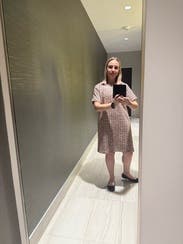 The dress is a very nice style for work—and I love that it hit slightly below the knee for me. However, the XL was just a little too big. I’m usually in between a 14/16 depending on the brand. Also, the color was nice but more reddish than pinkish as I assumed from the photos.