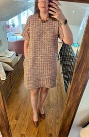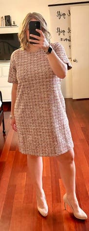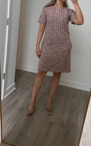 I got the small and am not sure even the XS would fit. Otherwise it’s nice, the tweed looks rich and is soft (sometimes tweed dresses can be really stiff). Very work appropriate, good length
