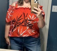 This top is described as red, more of an orange color. Shoulders stayed down well which was a big plus in my book. I liked but did not love this top.