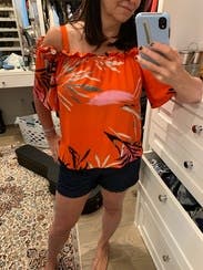 I’m not really a cold shoulder fan in tops, but I loved the orange and decided to try it out. Looked good tucked or untucked. Wore with jeans but also looks cute with black pants. Fit was great.