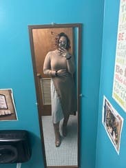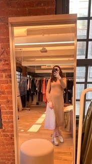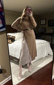 Very luxe looking dress! First trimester friendly, some form given to it when cinched at the waist with a belt.