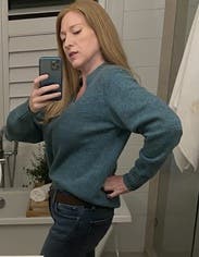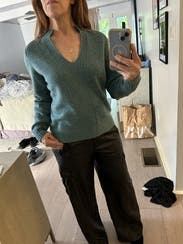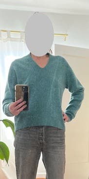 Naadam sweaters are so nice and cozy, soft and not itchy, feel high quality. This one didn’t look especially great but I wore it as much as possible because it felt so good. Runs large, this is an extra small. It’s meant to be baggy but I would have sized down if that was an option.