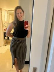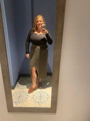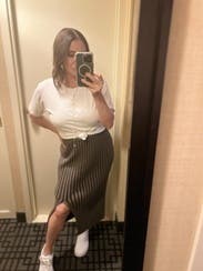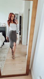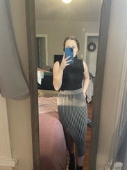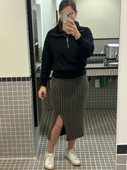 I liked this skirt - comfortable, didn’t ride up or move, and the slit was fun in the front and not too high. Color was a bit boring and it was very basic. Maybe the matching top would have given it a bit of an edge. Fit comfortably.