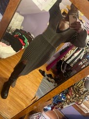 Wore shape-wear to minimize my hips; Fun olive green skirt with black ridges. Paired it with a black wide leather belt and black sweater and boots.