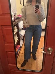 This sweater is so soft and warm, which makes it perfect for those chilly days. I love the slightly cropped fit. The collar detail adds a unique, stylish touch. It's so versatile - I can easily wear it over a t-shirt for a layered look or on its own. Definitely a new go-to in my wardrobe!