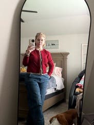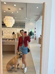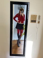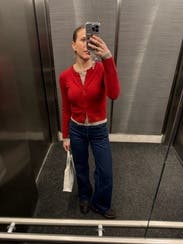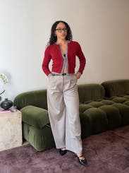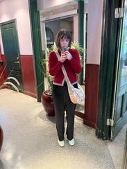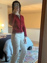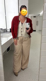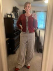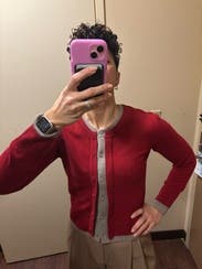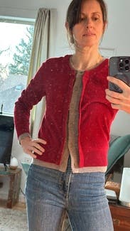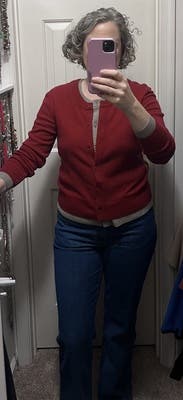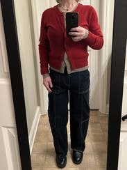 I love the layered look of this sweater. It looks like two cardigans, but without the bulkiness of an actual double layer. I wore it with the top two and bottom two buttons unbuttoned, which was flattering but not overly revealing. Fits TTS. I couldn’t tell from the photos what shade of red it is and whether it was a warm-toned or cool-toned red. I was happy with the color, which I would describe as a cool-toned cherry red.