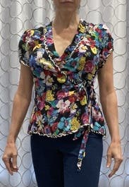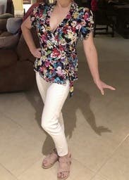 Very fun top. Can mix up the colors with bottoms and shoes since there are so many pretty colors in this shirt. I had to wear a cami because it was entirely too open and low. Fabric was also very elegant and soft.