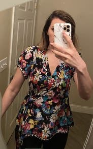 Cute. Soft material. Requires pins or a bodysuit if you’re a D-cup, to keep it conservative. Slight peplum makes it good for any body! TTS