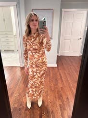wore this dress to a bridal shower and it was the perfect dress for a cool March day! the color is bright and springy but the long sleeves make it winter appropriate. the rouging around the stomach makes it super flattering—fits TTS.