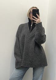 Nanushka Kylen Sweater combines a V-neck with a contrast zip-up mock neck, dropped shoulders, and finished with rib trims for an easy, oversized drape. Style with a pleated midi skirt and knee boots, or with barrel-leg denim and leather loafers.