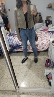 I've been looking for a cropped jacket and this one is perfect! Great length and overall fit. Can't wait to wear this to happy hour. If you're in between sizes I'd say size down. I only ordered the XS because the S was out of stock, but I'm so happy I did! I think the S may have looked too boxy or baggy. Def recommend this rental!