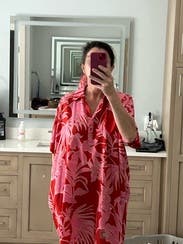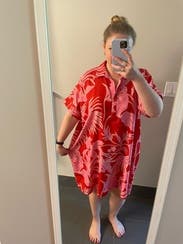 I wore this to check into my resort on vacation. I wore it a few other times as a bathing suit cover-up. I absolutely loved it. The colors are so beautiful and it is made of quality material. It never wrinkled. I would normally be a size large and I sized down with a still oversized fit. If it wasn't so expensive I would have purchased to keep.