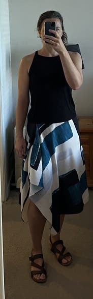 Wore on vacation in Spain. Loved the asymmetrical hem - but point is long if you're petite and not wearing heels.