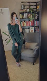 Ok I’m NOT a SAHM but I definitely felt like one. I got the set - luxurious, cozy, beautifully made. The pants def don’t hide anything. Great for a small frame looking to add some weight!