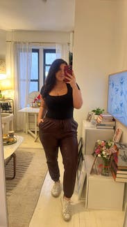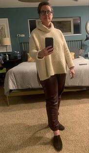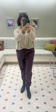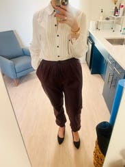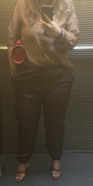 These were definitely a stylistic experiment when I ordered them, but my attempt at funky/elevated athleisure definitely fell flat. They are wayyyy too loose and look like an elongated Asian-style eggplant, or as though I am wearing garbage bags. I have a ~25-26” waist and ~34-35” waist, but the S was clearly the wrong size. The faux leather didn’t lend itself to an elegant drape, and the waist couldn’t sit high enough to define my waist at all. The fabric is not breathable for warmer weather but isn’t warm at all for cooler weather. It’s possible the XS would look better, but I disliked this too much to try another size. Def wasn’t something I’d bother trying to dress up w heels, although the Birk Bostons might have been excessively dressed down!