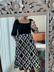 Black and white cotton (97% Cotton, 3% Spandex). A-line skirt. Pull-on. 30" from hip to hemline. Imported.