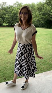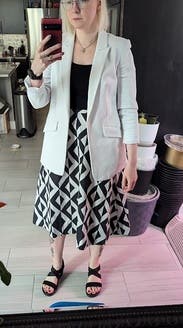 Perfect fit, amazing pattern. You can wear it with a T-shirt, or a blouse, heels, or sneakers.