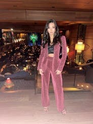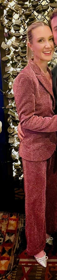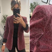 The color was so pretty! It's a sort of reddish pink and sparkled beautifully. The blazer is a little oversized which I think was perfect for the look. I ended up wearing this like the model without anything underneath and used some fashion tape to hold everything in. Also wore with the matching pants for a fun holiday party look!