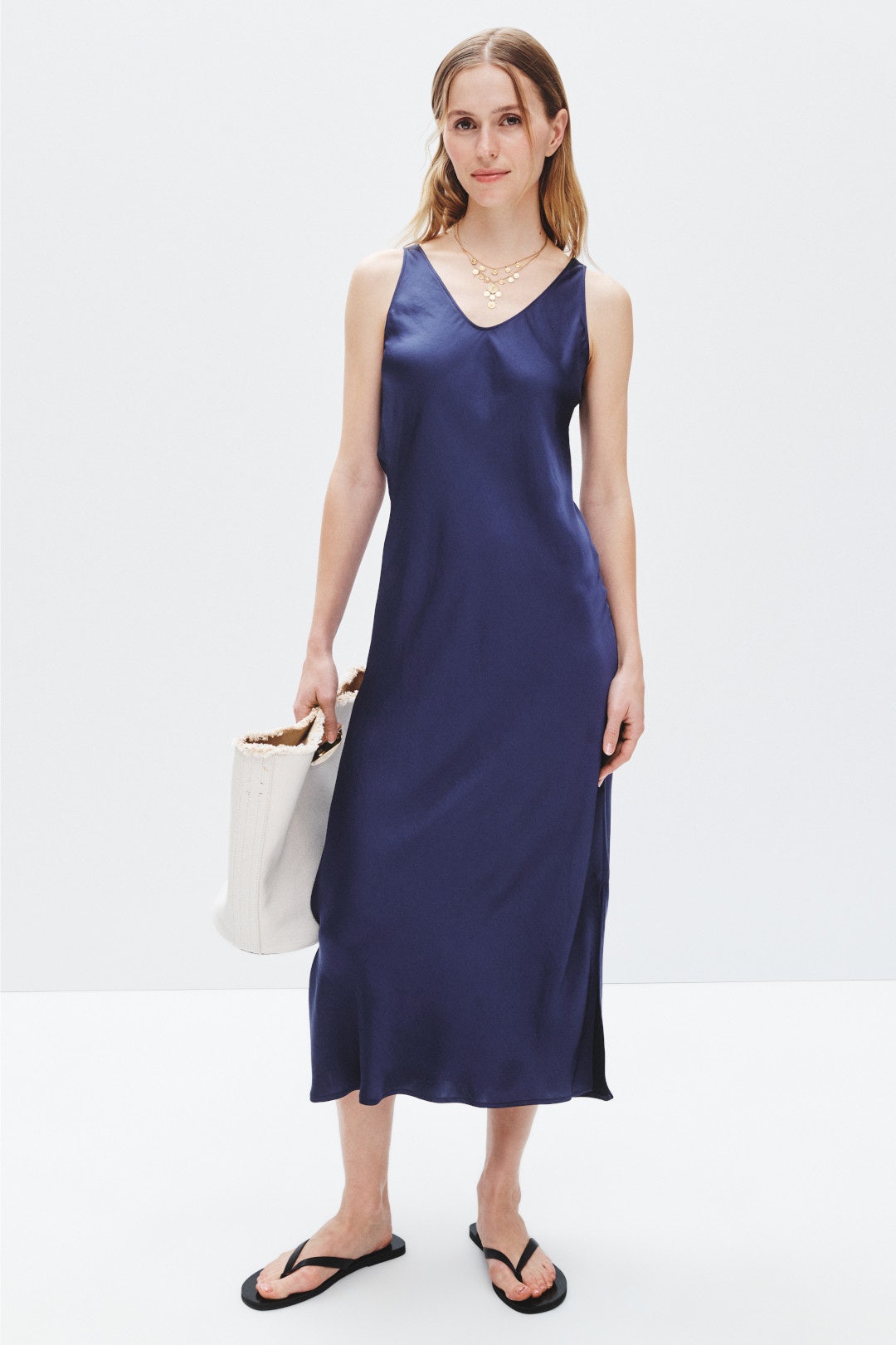 The NIC + ZOE Day Gloss Bias Cut Tank Dress features a flattering bias cut and a vibrant blue hue, creating a sleek silhouette perfect for warmer days. Pair it with neutral sandals and a lightweight scarf for a polished spring-summer ensemble.