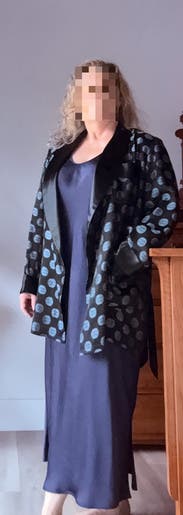 It’s hard to believe this dress is polyester, it feels and looks like heavy bias-cut silk satin in a deep blue. I haven’t traveled with it but I will at some point as it doesn’t wrinkle. Next time I could size down—it has a good shape with a slow curve and is forgiving at the waist and bust. I could easily wear a regular bra. I generally wear sleeves and paired this with everything from a translucent cashmere sweater to the vintage jacket in the photo. Easy to dress up and down. Love it!