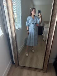 Nothing makes me happier than a dress that doesn’t require steaming. This dress was a light weight gauze material and as shown in the photo is very bump friendly. Rented up 1-2 sizes than my normal for the 31 week bump.