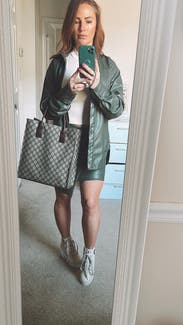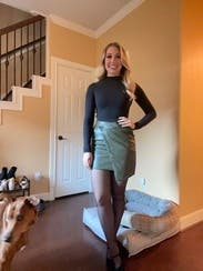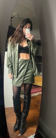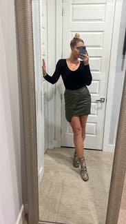 Love a leather skirt and felt this could be dressed up or down. Length was good for taller girls and fit was true to size in the waist but not as tight as expected throughout. Color was great.