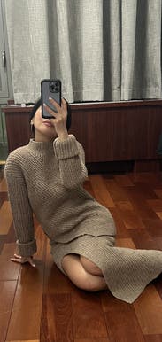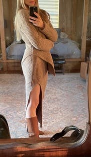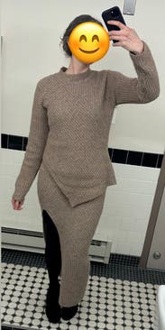 I loved this sweater and paired it with the matching skirt for work but also wore frequently with leggings at home. Be warned - it’s *very* warm. I went to a work event and could feel the sweat on my back in a crowded room, though it was great in my cold house in January or sitting at a desk! Sleeves were long, which was perfect for me, and the shortest part of the sweater still hit just below the skirt or high waisted leggings so I wasn’t cold due to the asymmetrical cut. Somewhat itchy even for me - I’m learning from RTR reviews I’m not super sensitive to this but I was sometimes glad to take this off at the end of the night.