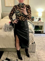 My outfit felt so elevated in this skirt. I loved it so much I'm contemplating buying it. It's a pretty thick material that has some stretch. I didn't feel the need to wear shapewear with it. Beware that the slit pretty much reveals your entire thigh when you sit down in it. I wore it on for a girl's night out and got lots of compliments on my outfit. Very sexy skirt.