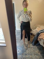Loved this skirt. Super cute and versatile. Wore to dinner with a friend but can be dressed up and dressed down. I’m kind of in between a 10 and a 12 but it’s pretty TTS.