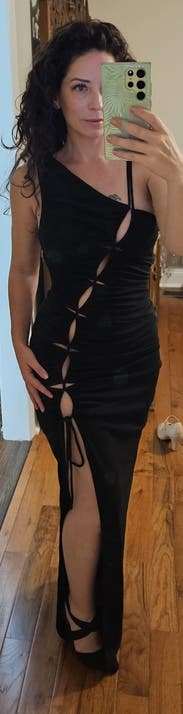 This dress is amazing - thicker material that pulls everything in - the cut outs are hot hot hot and so flattering on my curvy figure! Don’t get scared - RENT IT!