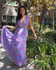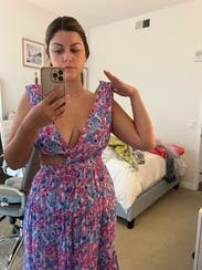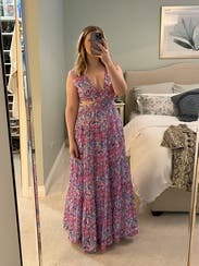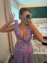Beautiful dress for summer events! Got lots of compliments and the cut out on the side is a fun detail. I had to tape and pin the dress down to make sure it lay flat in the front though