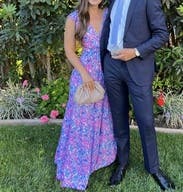 Wore this to a rehearsal dinner and it got lots of compliments. I felt really pretty in it too--I love a deep v and loved that it mirrored that in the back. Print and colors are true to the photos. Only watch-out I'd mention is that the waist runs a little small. My waist is about 25.5" and it was snug. I also had to pin the front, but idk if it's my chest being small or the dress being big.