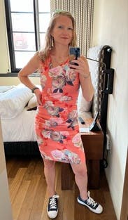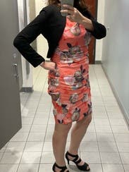 Loved the brightness of this dress! Wore it to a work conference, and it was form-fitting but not revealing. Liked it a lot!