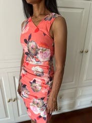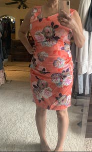 This totally fit the bill for a persimmon and purple themed luncheon fundraiser. The fit was good and I received several compliments. The fabric surprised me a bit because it was more of a linen blend than what appears in the photos online. Still cute just not as polished as I had hoped because no matter how much I ironed it wrinkled pretty easily. But the ruching helped to hide the wrinkles.