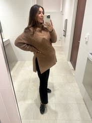 I really liked the fit of this sweater towards the end of my 2nd trimester. It was just a little itchy so I wouldn’t recommend ordering if you’re bothered by itchy sweaters.