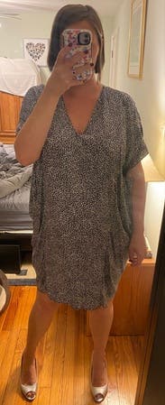 This garment was so comfortable!! I'm 7 months pregnant and really enjoyed the freedom it provides. I tried to belt it but with my baby bump it made the front too short. So I wore it as is and one of my students said I looked like his grandma haha. A medium would have fit better and I think I would still be just as comfortable. Overall I would wear it again even if I look like a grandma.