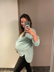 This was a cute top, but a bit short. If you have a longer torso it probably wouldn’t fit well. I wore a cami under it and it was fine. Currently 32 weeks.
