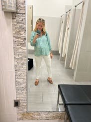 This top is so meh to me. Not only is it just not that cute, but the cut is weird. I’m 24 weeks along and have a decent bump. The front is almost too short and the back weirdly too long. The bottom of the front of the shirt barely covers the elastic on my maternity jeans, and the back goes way too awkwardly long. Maybe this would work earlier in second trimester/when you have a smaller bump, but then I feel like it would just look like a weird-printed fabric sack. Just not my fav.