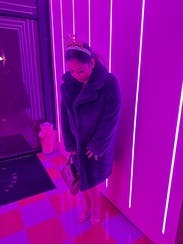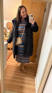 I felt very huggable in this super soft coat! The look I rented it to wear with was a velvet jumpsuit and together, the look felt like pajamas. But with a more structured dress underneath (or jeans) it feels fun as it starts to get chillier!