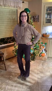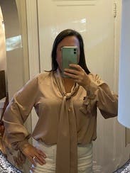 I liked wearing this. I’m 5 foot eight and although it’s somewhat short, it was doable and I was able to tuck it into a high waisted skirt. It fit well, and I have a full bust. I loved the next scarf. It could be tied multiple times around your neck, in a bow or like a tie. Up to you. Seems like a high-quality top. The sleeve bows are complicated. I need help to tie those…. but they look good.