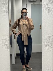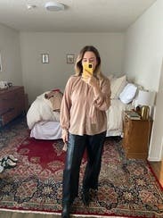 Beautiful top that is easy to wear. The ties at the wrists were a little tricky when eating but overall loved this top!