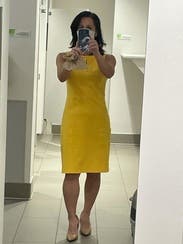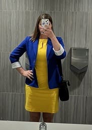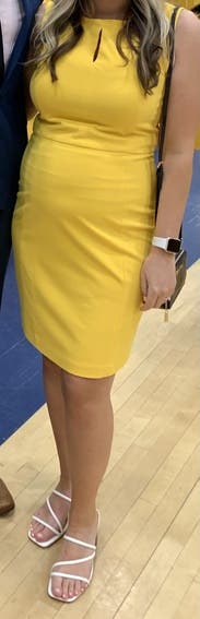 Lots of compliments on the popping yellow color. Very comfortable and not too tight. I added a white jacket to elevate it for work.